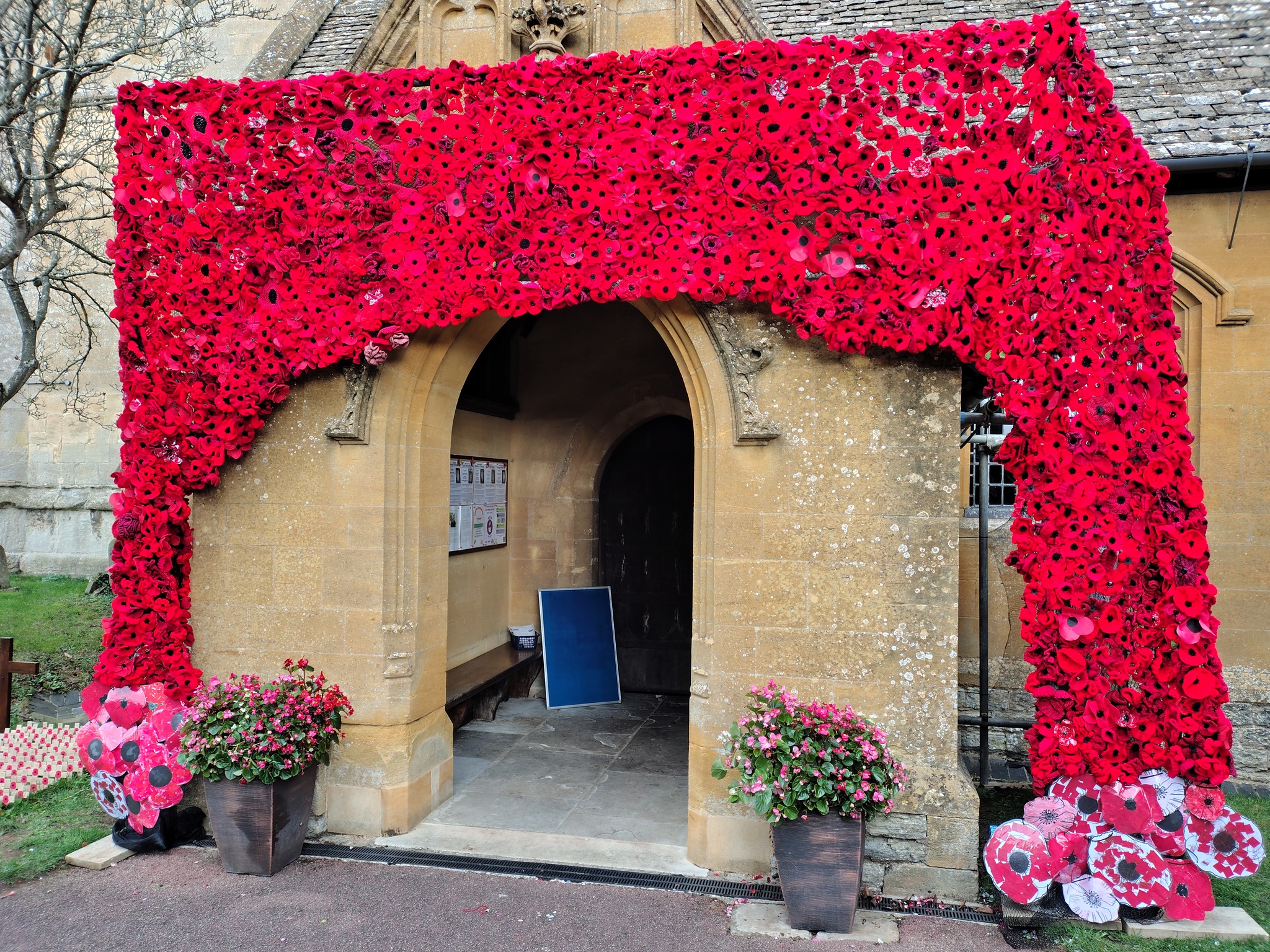The Badsey, Aldington and Bowers Hill community have created a beautiful poppy cascade across the porch of St. James' Church, Badsey. Over 3,500 poppies were created by the Badsey Belles WI, members of Badsey First School and many others in the village.